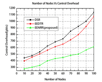 Figure 11 shows the graph between the varying number of nodes and the control overhead in packets for the proposed EENRR algorithm and compares them with the existing DSR and EEDTR protocols. When the density of the node increases from 10 to 100, the average control overhead increases since more number of control packets are used for route discovery and maintenance. The EENRR protocol shows better performance like reduction of the control overhead by 41.15% over the DSR and EEDTR protocol by 31.51%. This reduction in control overhead is achieved by minimizing the number of retransmission and route discovery by forming a more stable energy efficient route. In EENRR, the control packets like RREQ and RREP are considerably reduced by instead of flooding them. EENRR chooses only one neighbor node which will forward the RREQ to its neighbor.