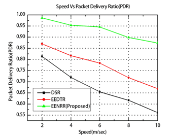 Figure 13 shows the graph between varying speed of the node in m/s and the packet delivery ratio for the proposed EENRR algorithm with existing DSR and EEDTR protocols. When the speed of the node increases from 2 to 10 m/s, the average packet delivery ratio decreases because the frequent topology change causes drop in packet delivery. The graph shows that the proposed EENRR algorithm increases the packet delivery ratio by 38.36 % over the DSR protocol and 23.78 % over the existing EEDTR protocol.