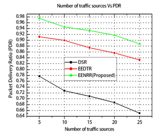 Figure 14 shows the graph between varying number of source destination traffic and the packet delivery ratio for the proposed EENRR and the existing DSR and EEDTR protocols. When the traffic sources increase from 5 to 30, the average packet delivery ratio decreases because the number of routes between the source and the destination is reduced due to the minimal number of available intermediate nodes. The statistics shows that the proposed EENRR algorithm increases the packet delivery ratio over the existing DSR by 31.48 % and EEDTR protocols by 7.75 %.