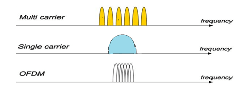 Orthogonal frequency division Multiplexing (OFDM), is the succeeding technology for high speed communication system. In the previous section, we analyzed Error Performance of Proposed Communication System. OFDM system model has been adopted for BPLC communications as it gives better performance at high frequencies used in BPLC [13-17]. OFDM is a special form of the frequency-division multiplexing (FDM) multicarrier modulation technique. In multicarrier systems, the information to be transmitted is split into multiple smaller chunks and transmitted independently. Each of these subcarriers contains numbers of parallel data streams or channels and is modulated conventionally at a low symbol rate; these are groups of bits of data related to (but not the same as) gross bitrate, which is expressed in bits/second. The single carrier, multi-carrier, and OFDM frequency spectral curve is shown in figure (9) below [14].