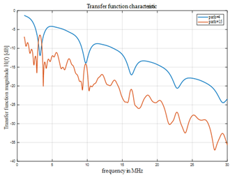 In the paper, a dynamic model of powerline is considered for investigations. The cable data used in this case is a two conductor Copper conductor of diameter 8 mm, the space between the conductor is 0.15 meter, PVC insulated. It is the cable which is commonly available for house-wiring. Based on the transfer function equation (4), A software tool for obtaining the channel transfer function is developed. Also, the structure for the typical indoor broadband powerline communication network channels are shown in figure 2 is investigated; its performance is illustrated in Fig. 4. Lengths of sections L1, L2 and L3 are 30 m, 170 m and 11.5 m respectively. The rest parameters are adopted from [2] as in table 3 and 4. Simulation is showed at the example that the number of paths N is 4 and 15. In the part of equation (4), the attenuation term of the channel model, the constraint sets at k=1, a0 =0 and a1 7.8 × 10−10 s/m. [ 2]. Figure (5) illustrated the channel frequency response plot for 4,15-paths, indicates that the varying trends of the transfer function in the frequency series of 1-30 MHz.