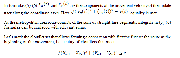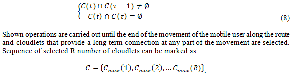 It is known that this sequence can be determined at the beginning of the movement using the movement route information of the mobile user and set of cloudlets in metropolitan environment. Sequence can be modified if information about technical conditions of the cloudlets changes during the movement. It should be noted that the found solution allows the mobile user to use a minimum number of cloudlets for connection while moving to the final point of the route. At the same time, the given method enhances the efficiency of use of cloudlet resources by establishing connection with a few cloudlets. Thus, frequent establishment of frequent connections and disruption of connection leads to the inefficient use of cloudlet resources.