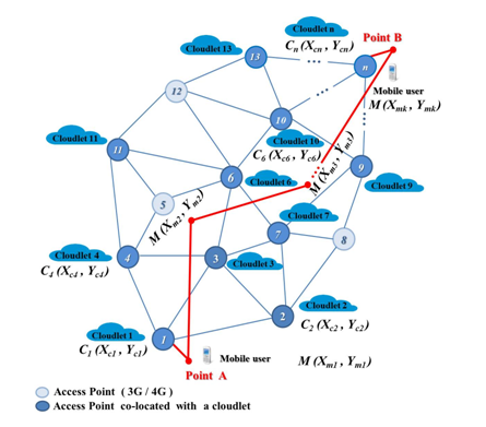 No problems arise when users use the cloudlet resources in a stationary state (not in motion). For instance, the software needed by the user is downloaded and used at the nearby cloudlet. However, a problem arises in using the cloudlet resources when the user is in motion (pedestrian or machine). Cloudlets are placed near the base stations of wireless city-type mobile networks. The mobile user first downloads the software application to the nearby cloudlet.