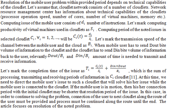 In [12], the article reviews the solution of selection issue of virtual machines that can provide a faster resolution of the issue, based on the user’s requirements, using the technical capabilities of the cloudlets and the virtual machines created in the cloudlets. In [13], the article reviews optimal balanced distribution of mobile network of mobile applications among cloud servers. Significant impact of conductivity of inter-cloudlet connection channel on rapid implementation of mobile applications was reviewed [14]. Some research works [15, 16] are dedicated to development problems of a cloudlet network infrastructure located in proximity of metropolitan wireless area network access points. It is best to create cloudlets in proximity of all Access Points of the noted network. It is not economically efficient and makes the value of created network more expensive. On the hand, it is possible that cloudlets located in proximity to certain access points are rarely used or unused. Thus, it is proposed to place more cloudlets in proximity of locations with a higher number of mobile users (malls, libraries, schools, universities, stadiums, stations, airports etc.).