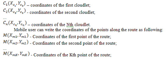 Computing experiments on developed model was implemented using following data. Here, all measurements are provided in proportion to r distance. Movement route of mobile users surrounded with cloudlets is depicted in Figure 3.