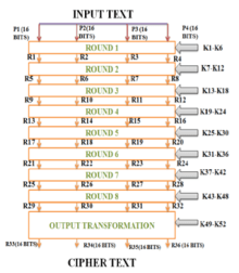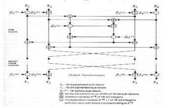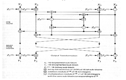 Figure 2 shows IDEA steps of logical and arithmetic operations executed in each round to produce encrypted data to be input of next round. The steps are summarized as following: