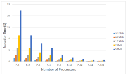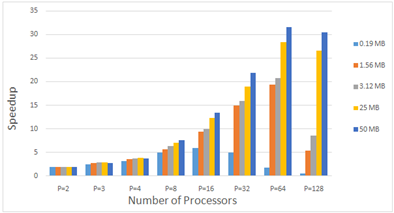 Is calculated by taking the ratio between the serial and parallel time [7]. According to Figure 7 which shows the speed up to five different plaintext sizes on2, 3, 4, 8, 16, 32, 64, and 128 processors. The results show as following: