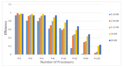 Is computed by taking the ratio between speedup and number of processors [6]. Figure 8 shows the parallel efficiency of parallel IDEA algorithm for different plaintext sizes on a different number of processors. The results show that the parallel efficiency of a parallel IDEA algorithm is the best when the number of processors equals 2, 3, 4, and 8. The parallel efficiency decreases when the number of processors increases from 16 to 128. Finally, the large plaintext sizes achieved the best and kept on high-efficiency values across the different number of processors.