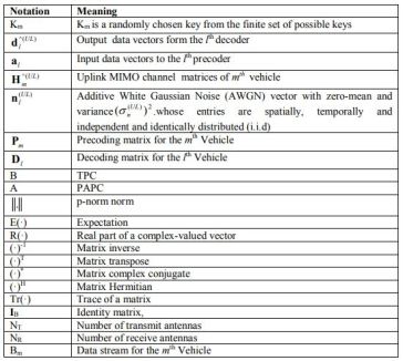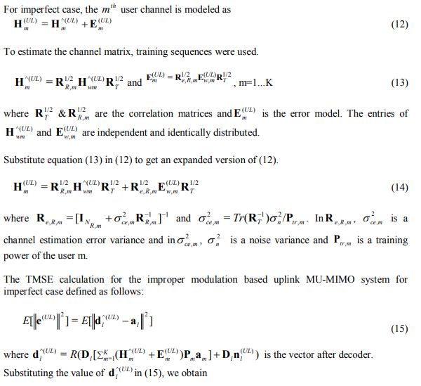 The mathematical model for uplink MU-MIMO system by assuming channel matrix H is perfectly known to both transmitter and receiver is derived as follows. This model is used to minimize the TMSE for the detected symbol. The notations and their meanings used in this paper are given in Table 1.
