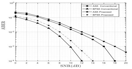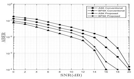 The p-value is further reduced close to unity (p=1.76), and its ABER is evaluated as in Figure 9. It is observed that for BPSK modulation, both TPC and PAPC require an SNR value of 2.5dB and 4-ASK modulation requires an SNR of 6.5dB at 10-2 ABER. This makes the SNR requirement for PAPC is same as TPC. From these results, the proposed system found to be optimal for practical realization.
