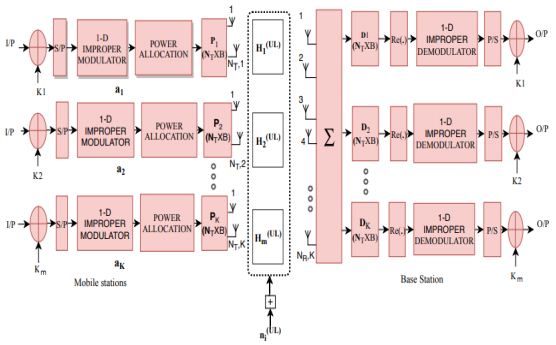 The block diagram of the proposed MU-MIMO uplink transceiver system with ‘m’ channels is shown in Figure 2. For the encryption process, the analog data obtained from the sensor is converted into binary and XORed with a key to get cipher text. This encrypted plain text is converted to parallel form and modulated using 1-D improper modulator for transmission. Digital modulation scheme yielding improper signal is called as improper modulation. In the proposed linear MIMO transceiver system improper modulation such as BPSK and M-ary ASK was implemented its pseudo-autocorrelation and cross-correlation function of complex envelope signals are assumed as nonzero [18]. A linear precoder concerning PAPC (α) is used to encode data stream of each VNs. Since the uplink channel matrices are complex, the coded data streams are multiplied by complex channel matrix (Hm(UL) ) and decoded by the linear decoders at the receiver. As the modulator outputs consist of only real components. Hence the real part of decoder output is considered for detection. The precoder and decoder matrix is updated based on the assumption of perfect and imperfect channel state information known at the BS and VN.