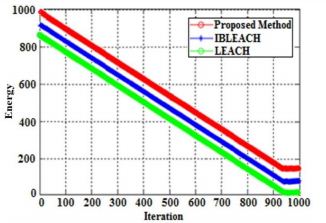 At Round 1000, LEACH has the lowest energy level of about 15 Jules. The energy level of IBLEACH is approximately equal to 82 Jules. On the other hand, the proposed method has the highest energy level of 154 Jules. This result is concluded alongside the FND and HND criteria, indicating that our proposed method is 927% higher than LEACH and about 88% higher than IBLEACH.