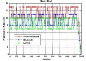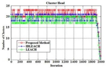 The number of cluster heads in different methods versus rounds for 100 nodes is shown in Figure 6. In this case, because the number of clusters decreases by decreasing the energy of nodes, the chart is descending. On the other hand, since the selection of cluster head is probable, the shape of the graph is zigzagically goes high and low.