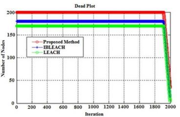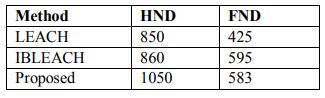 As specified in table 2 and figure 8, the proposed method is better than IBLEACH and LEACH methods, taking into account the HND and FND criteria. Like in previous cases, LEACH has the lowest performance, because the reasons for low performance in the first case are true for this case.