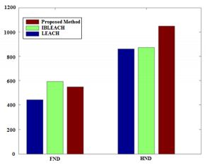 If the FND criterion is considered, the proposed method is better than LEACH with 147.5% and approximately 46.6% better than IBLEACH. If the HND criterion is considered, the proposed method is about 43.5% higher than LEACH and approximately 2% higher than IBLEACH.