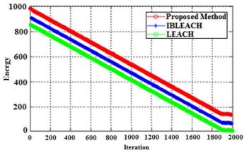 The total energy remaining in each algorithm for network size 200Í200 and 2000 round is shown in figure 9. At Round 2000, LEACH has the lowest energy level of about 12 Jules. The energy level of IBLEACH is approximately 75 Jules. On the other hand, the proposed method has the highest energy level of 142 Jules. This result is concluded alongside the FND and HND criteria which is 1083% higher than LEACH and 89% higher than IBLEACH.