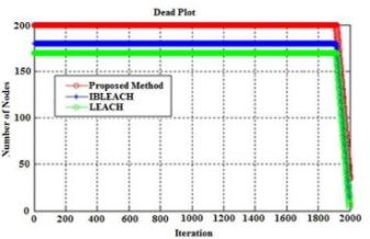 The results of this situation clearly show that unequal clustering algorithms such as IBLEACH and the proposed method where to use a multi-hop routing protocol, have a better result. Because the batteries of the sensor nodes that are closer to the base station are discharged faster. However, these methods control this condition by decreasing the size of clusters near the base station. In this case, the IBLEACH performance in FND is higher than the three clustering. At LEACH, sensor nodes start to die sooner than the rest of the algorithms. At this criterion, the proposed method is 37% better than LEACH but 2% weaker than IBLEACH, which FND criterion is less important than the HND criterion.