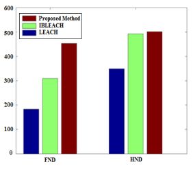 Figure 3. Comparison the FND and HND of the proposed method with IBLEACH and LEACH algorithms for 100 nodes in round 500.
