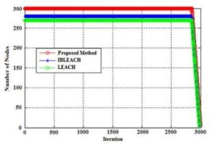 Figure 5. Number of network live nodes in 100 nodes for proposed method, IBLEACH and LEACH algorithms in 1000 rounds