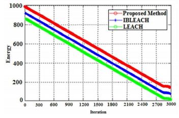 Because LEACH does not consider the residual energy level of the sensor nodes during clustering, it has the weakest performance. This algorithm uses a pure probabilistic model for clustering that is not enough to obtain the best solution. Since IBLEACH considers energy parameters and local distances in each cluster cycle, it has a better performance than LEACH. The IBLEACH method and the proposed method consider the level of energy of any cluster head to compute the clustering radius. This means that if the cluster head has more energy, it will have a larger cluster radius. In other words, there are more sensor nodes in that location. This feature ensures more work is assigned to the cluster head that has more energy. This idea makes our proposed algorithm to perform better than other algorithms in this case.