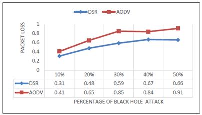 From Figure 10 below, it can be observed that packet loss for both protocols under black hole nodes increases when the percentage of the attack is increased. Also, as discussed earlier in the simulation of the normal protocols section, the DSR protocol has better performance than the AODV protocol for the same reasons discussed in the normal protocol.