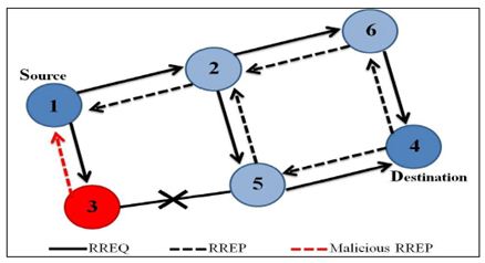 Black-hole attacks happen at the Network layer [6], in which a malicious node declares to other nodes that it has the shortest route to their destination node. The malicious node will drop all data packets or implement man-in-the-middle attack. For example in figure 3, the malicious node number (3) sends fake routing information by advertising that it has the shortest path to the destination node (4). When the node (1) wants to send a packet data to the node (4), it will initiate route discovery. The malicious node (3) intercepts the RREQ packet and sends a reply RREP to the sender node (1). If the reply from the malicious node (3) reaches the source first, then the sender node (1) disregards all other RREP messages and start sending packets through node (3). Therefore, all packets are lost or consumed at the malicious node.