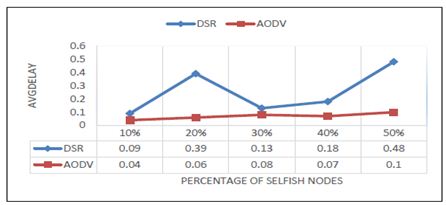As can be seen from Figure 5, average delay of DSR is higher than AODV. Because DSR is an On-Demand source routing protocol, this can be considered as the major reason for DSR delay. A route is discovered only when needed and also, the mechanism for route discovery happens each time as well as, several paths to the destination is discovered. Consequently, DSR has higher delay. On the other hand, AODV has just one path for each destination in its routing table, which is updated permanently based on a sequence number. Thus, that leads to a slight end to end delay. Also, AODV was not impacted very much with increase in the percentage of selfish nodes, unlike DSR, which was impacted when selfish nodes increased.