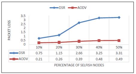 From line graph in Figure 6, it is obvious that DSR was affected excessively by the selfish nodes, despite DSR being better in normal protocols. While AODV as a standard protocol does not have better performance than DSR, in the case of selfish nodes it is better in performance than DSR.