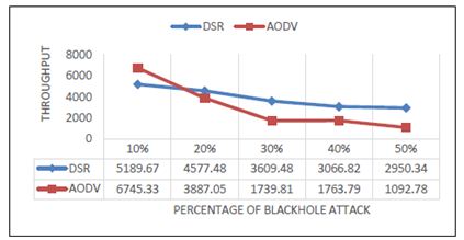 Figure 8 illustrates throughput of both protocols under different percentages of black hole nodes, and it is clear that both protocols are affected by increasing the percentage of the black hole attack. However, it is obvious that DSR outperforms AODV when the percentage of attack nodes has increased. This performance can be justified because of the different nature of DSR and AODV networks and their different techniques to achieve routing activities, such as the packet salvage of the DSR protocol in NS2.