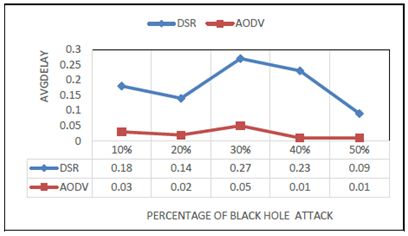 In Figure 9, the line graph shows the average delay of both protocols under black hole nodes. Both protocols have approximately the same nature in terms of performance when assessing the average delay metric as the average delay fluctuated over the time of the simulation. However, AODV suffered less delay than DSR in all the percentages of attacks, for the reasons discussed in the previous section.
