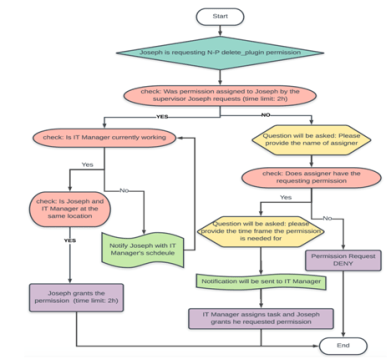 In this example, Joseph is an employee who holds a QA job position for the Bata Style website: batastyle.com. Employee Joseph is requesting for sensitive permission such as delete_plugins. Corresponding to Figure 5, a work flow on the ABAC system for requesting sensitive permission is illustrated. Once Employee Joseph requested the delete_plugins permission in Non-Production environment, the system checks the database record on whether the supervisor (IT Manager in this case) has assigned the task with the requested permission to the employee before.