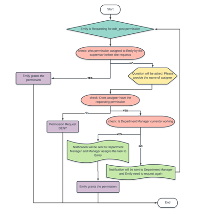 In this example, Emily is a designer at Microsoft company. Emily is requesting for general permission. Figure 6 demonstrates a workflow on the ABAC system for requesting general permission. Once Emily has requested the edit_post permission, the system checks the database record on whether the supervisor (Department Manager in this case) has assigned the task with the requested permission to the employee before.