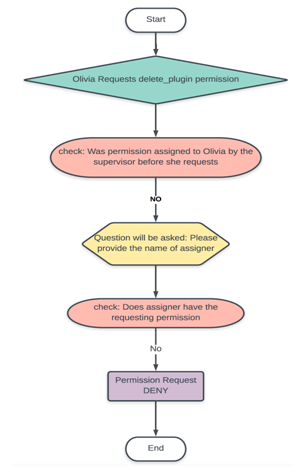 In this example, Olivia is an employee who holds a Content Contributor job position at Microsoft company. Olivia is requesting general permission. As we can see in Figure 7, it is a workflow on the ABAC system for requesting general permission. Once Olivia has requested the edit_post permission, the system checks the database record on whether the supervisor (Content Author in this case) has assigned the task with the requested permission to the employee before. Content Author did not assign the task to Olivia before Olivia request permission. The person who assigned Olivia the task does not have the requested permission. Permission will be denied.