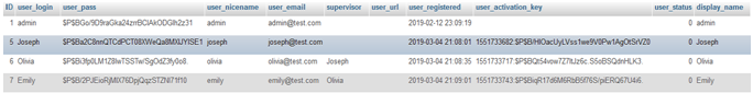 Figure 8. Data for wp_data table, Olivia (Editor) is supervisor of Emily (Author)