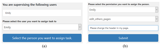 For the purpose of illustration, we provide a series of snapshots of this plug-in. By combining the internal wp_users table from WordPress database with the external employee database, the management chain is integrated into WordPress and used by the plug-in (cf.Figure 8). Supervisors can assign tasks with corresponding permissions to employees (cf. Figure 9) by going to Plug-in submenu that is called “Assign Tasks”. (cf. Figure 10)