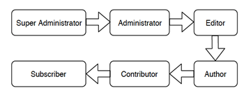 In the default WordPress application, there are six roles: Super Administrator, Administrator, Editor, Author, Contributor, and Subscriber. Figure 2 below demonstrates the hierarchy structure of roles in WordPress application [19], the higher the role in the hierarchy, the more permission a role has. The super administrator has all the permissions that the administrator has; the administrator has all the permissions that editor has; the editor has all the permissions that contributor has and contributor has all the permissions that subscriber has.