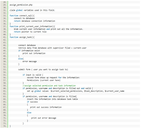 In Figure 16, it is a screenshot of the assign_permission.php file, line 41 to 74 introduces the assign_task() function. The assign_task() is responsible to validate the input information and insert the data into the task table.