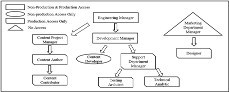 Figure 3a is an inverted tree that illustrates the Engineering Department Structure of Microsoft Company [20,21,22]. For example, both the Development Manager and Engineering Manager require access in Non-Production and Production environment. The reason is that Development Manager and Engineering Manager are responsible to implement the functions on the website and deploying website from Non-Production environment to Production environment. In contrast, Content Developers’ duty are developing and testing new functions. Therefore, they only need the access to Non- Production environment. By limiting accessibility to the one who needs the permission also helps on protecting the stability of the Production environment. In addition, Marketing Department is separated from the Engineering Department. They are responsible for managing company’s reputation and providing necessary resource to the engineering team. Hence, they do not need any access to the website. And all other roles in the figure only have permissions in the Production environment. This analysis is based on users’ attributes and environmental attributes.