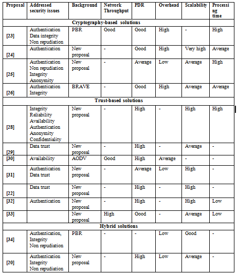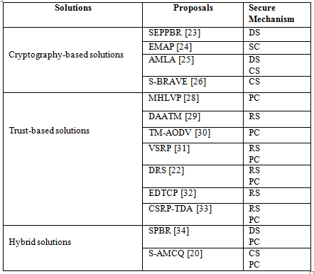 The main objective of the above-presented approaches is to secure vehicular ad hoc routing. Those protocols could be categorized in chronological order into secure mechanisms based on cryptography, or on trust, or on both.