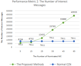 For the number of transmitted request messages, as shown in figure 10, the MC nodes play a very important role on how to increase the number of interest messages. In emergency applications, it is required that the number of interest messages has to be increased in order to satisfy the emergency applications requirements of IoT. This figure shows that the normal CCN has a low number of interest messages due to the fact the each request message have to receive the corresponding acknowledgment from the related producers before sending the interest messages (i.e. one-to-one mechanism), but in many-to-one mechanism, many data messages can be transmitted at once in response to one interest message which increases the possibility for accelerating the number of transmission cycles and hence increasing the number of interest messages during the simulation time.