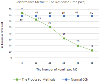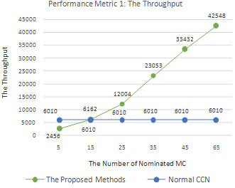 For the throughput, figure 9 illustrates the transmission of the successful packets. It is obvious that when increasing the number of nominated MC nodes the number of successful arrival packets is increased gradually. The throughput of the proposed techniques outperforms the normal CCN. When the number of nominated MC is between 65 and 35 the improvement in the throughput is about 26% and 14% when comparing the proposed techniques and the normal CCN.