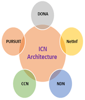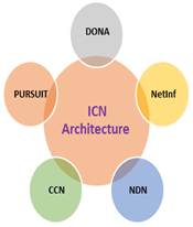 During the last decade, many efforts have been focused on how to improve the future architecture of the Internet. All of these efforts concentrate on the data-centric architecture rather than host centric architecture. For example, Content-Centric Networking (CCN), Data -Oriented Networking Architecture (DONA), the Named Data Networking Architecture (NDNA), the Network of Information (NetInf), and the Scalable and Adaptive Internet Solutions (SAIL) [8]. The concept of Information- Centric Networking (ICN) was proposed in 2006 which is the architecture that focuses on data communication rather than who is communicating (i.e. content centric communication rather than the location of a user who has a unique IP address). After proposing ICN architecture, many efforts tried to enhance its performance. For example, DONA focused on how to improve the security of ICN architecture. The Publish- Subscribe Internet Technology (PURSUIT) tried to replace IP protocol stack with a push/subscribe protocol stack. NetInf focused on the scalability of the Internet. CCN was proposed in 2007 which focuses on the content communications, after that some efforts come to improve its performance and supported applications such as NDNA [9]. ICN architecture is shown in figure 2.