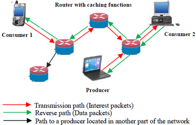 The main focus in this section is CCN which is based on the name of the contents. Packets (i.e. interesting packets and data packets) will be routed based on the name of the content instead of the IP of the source node and the destination. In CCN a user makes a request for contents by sending interested packets that have the name of the contents. Data packets will be delivered in response to the request in the return path until they reach to a source node. During data packets transmission, the content will be stored in all nodes which are located in the routing path. Packets are divided into chucks that have identification numbers in order to collect these chunks and then forming the original packets at the source node which made the request for the contents. All the contents will be cached by the intermediate nodes which generate data packets that contain the requested content, these intermediate nodes are distributed in the reverse routing path. In CCN, nodes that made requests for contents and sending interested packets are called consumers, while nodes which response to the requests made by consumers and provide the required contents through sending data packets are called producers [10]. An overview of the communication between a consumer and a producer in CCN is shown in figure 3. The figure illustrates the difference between the interest and data packets.