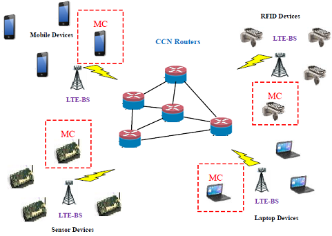 The transport mode of the network model which is discussed in the previous section aims to reduce the computational complexity and the power consumption in order to transfer both interest and data packets effectively and as fast as possible. As shown in figure 4 for the network model, the sensing areas include many objects which sense the physical phenomena and send packets from one part of the network to another using LTE-BSs and intermediate CCN routers.