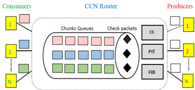 Figure 7 below demonstrates an example of how the consumers access the CCN router queues. In this example, we haven contents producers. The producer 1 has a normal content specified as /data/hospital/making appointment. This content is giving the priority number 2. The producer 2 has an emergency application content specified as /data/hospital/calling ambulance. This content is giving the priority number 1. The lower priority number means the content has a higher priority. In our example, both producers announce their content priorities to the CCN router. The consumer 1 asked for the content type /data/hospital/calling ambulance and the consumer 2 asked for the content type /data/hospital/making appointment. The interest packets sent from both consumers will access the CCN router queues at the edge of the router and the check is applied for both the packet type field and the name of the interest which is requested by each consumer. The router recognized that the consumer 1 interest packets has bit=1 in the packet type field, and the consumer 1 asked for urgent contents which is provided by the content producer 2. So, the corresponding PIT information is reordered and the request (the interest packet) is sent to the producer 2 in order to send back the data packets in the reverse path in a many-to-one mechanism. The sending of interest packet follows the network routing procedures which we assumed to be a multi-hop transmission scenario. The mechanism is repeated for all packets which enter the CCN router queue.
