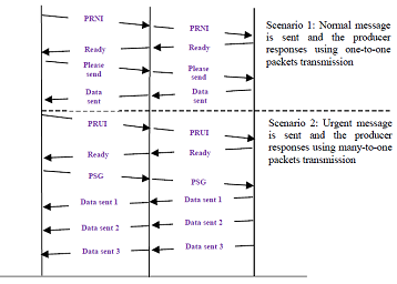 Scenario two, when the selected MC consumer has an urgent interest packet for emergency application (e.g. sending a request /data/hospital/calling_ambulance), the CCN router found that the first bit in the packet type field is 1, and the name of the request is recognized as a high priority request after all producers accounted their contents pritto the CCN router. In this case the many-to-one packets transmission mode is activated which means that the content provider will send all related data content (packets) in response to the one request made by the consumer. It is like forming an end-to-end session between the consumer and the content producer. We believe that the emergency applications require packets to be delivered as fast as possible, and one-to-one packet transmission mode is not useful for urgent packets even if this mode ensures reliability when sending one request and waiting for the corresponding response. Thus, we CCN router will take the responsibility to determine which packet transmission mode need to be applied based on the type of the interest packet and the priority of the contents which are announced by the connected contents producers. Now, the consumer sends its interest packet in a message which we call Prepare_Requested_Urgent_Intersest (or PRUI message) and includes the request number in the packet header. The CCN router sends PRUI message to the content provider which is connected to the router. The content provider responses by sending a Ready message to the consumer. After that, the consumer unicasts a message called Please_Send_Group (or PSG message) to the producer which has the contents. The whole group of packets will be sent after forming a session. Once the provider receives PSG message, the data message will be delivered in chunks until the whole data packets for the session are delivered to the consumer. The message Data_Sent is delivered to the consumer to satisfy the PRUI message. This scenario is repeated for all urgent interest packets. Figure 8 illustrates the message flows for the two scenarios.
