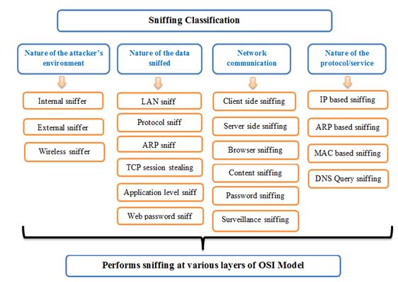 The most malicious case for DDoS [1] attacks is the sniffing which can be implemented by tools or can be done manually for attacking the victim system. The attacks caused by this process is called sniffing attacks and fully automated tool used is named as sniffer or packet analyzer. These sniffing attacks are one of the causes of DDoS attacks. Most of the sniffing attacks are involved in capturing sensitive information/data like user credentials, password, secret codes, PIN, and so on. Sniffer performs its operations in two modes, namely promiscuous and not- promiscuous. In the former one, the sniffer can pilfer information from all the devices connected to the network and in the later one, only the information going to and from its host system. Based on the type of information stealth and ways it performs the sniffing, it has broad classification as shown in Figure 1. Sniffing attack can be in two ways Active sniffing and passive sniffing. The former one can be detected where the attacker can sniff the traffic in the network, whereas the later one is difficult to detect but can be prevented [2]. Also, B. Prabadevi and N. Jeyanthi [2] present some of the active sniffing tools used to sniff the data via a network for launching various attacks in the network and anti sniffer tools.