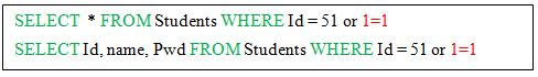 The queries mentioned in Figure 4 give the same results, i.e. both retrieves the student’s id, name, password of all students in the database as the condition 1=1 is true always. When the SQL injection query results are not visible to the user, then it is blind SQL injection. To mitigate these attacks, parameterized statements can be used. Sadeghian et al., classify SQL injection attacks under seven major categories which are cause for these attacks [29]. They derived a taxonomy of SQL injection attacks’ mitigation mechanisms, which includes detection and prevention techniques adopted by various researchers [14].