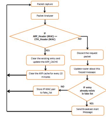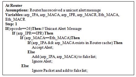 The following Cross-Layer Consistency Checking (CLCC) technique by B.Prabadevi and N.Jeyanthi can mitigate ARP sniffing attacks [32]. CLCC is evaluated using the lattice model. The system consists of the following components: Packet analysis, ARP cache updating, fake list updation and generation of broadcast Alert Message. The packet analysis component determines the correct ARP packet depending on the opcode, if the opcode is 1 it is ARP Request, if 2 it is ARP Reply, if 25 it is broadcast Alert message and if 26 it is a unicast alert message to the router.