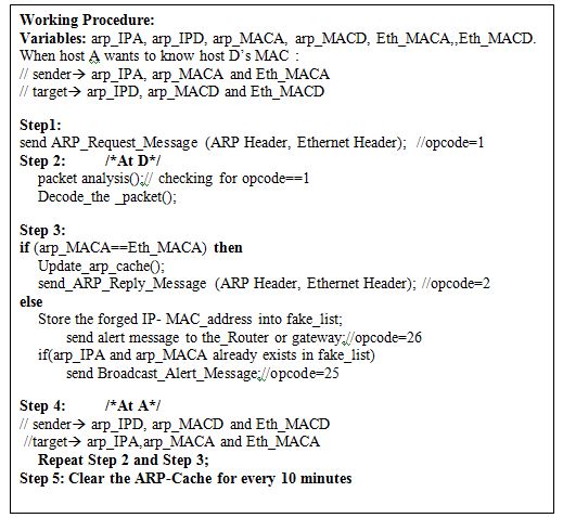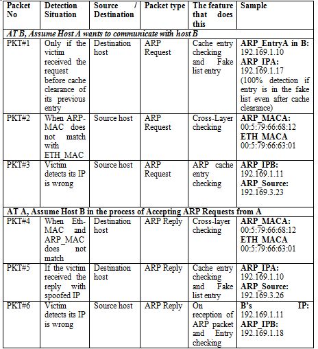 Table 2 below provides the details about the possible packets that the proposed system detects. These packets, when detected, can avoid DoS, MiTM, and host impersonation to some extent. Though the proposed system can able to detect these packets, still the same problem persists with this ARP viz., a host will still receive a reply for an unsent request. The fake list table used here is